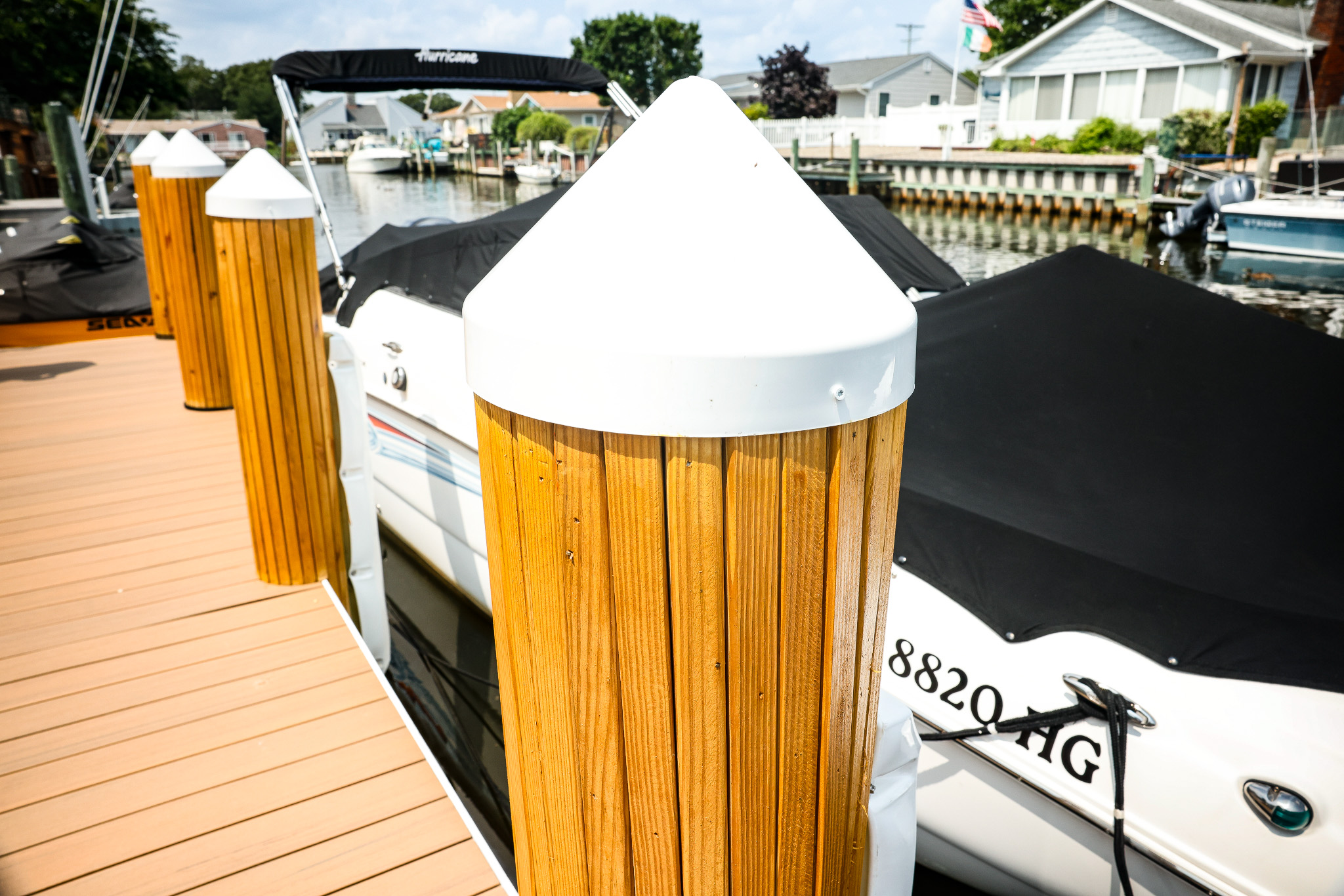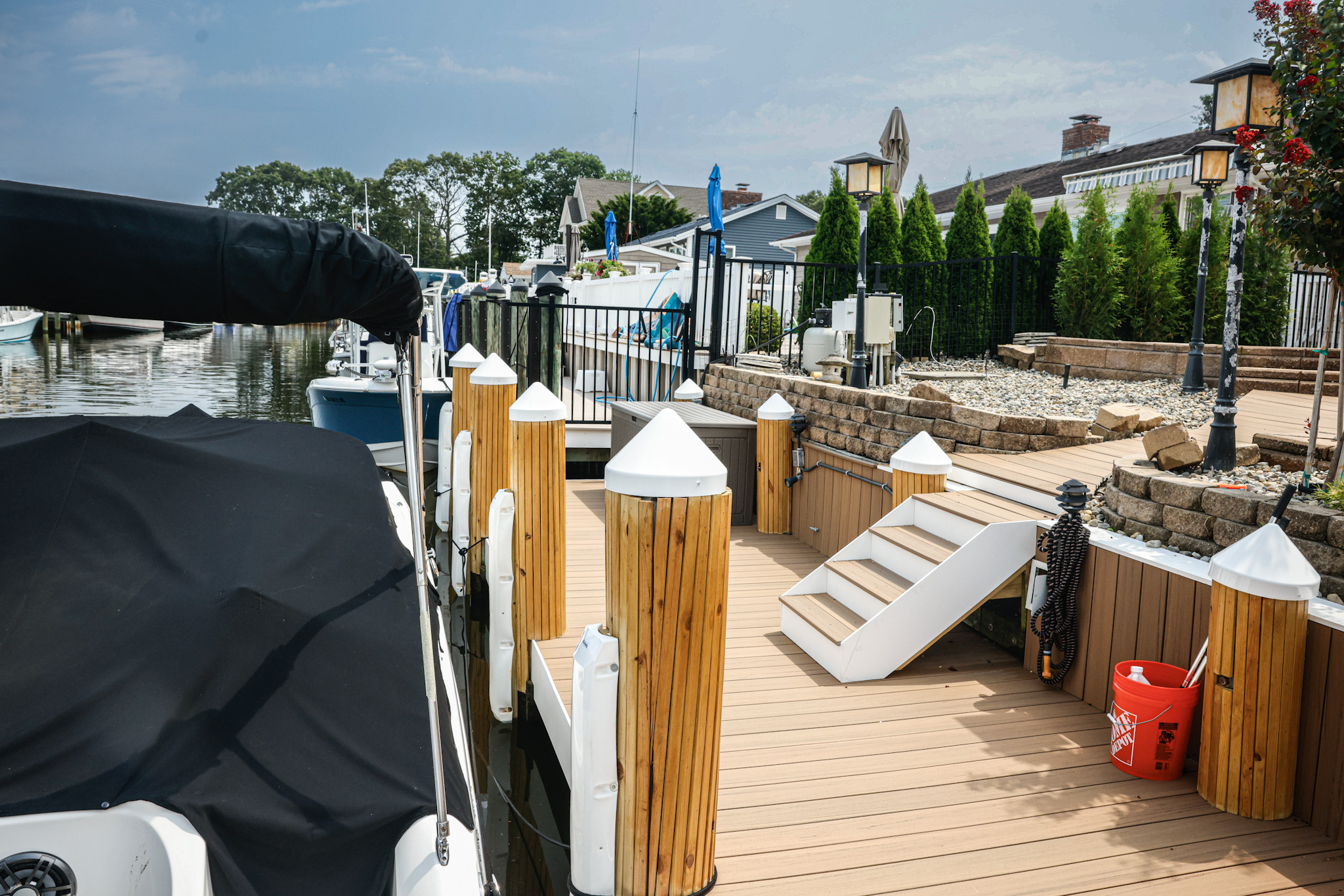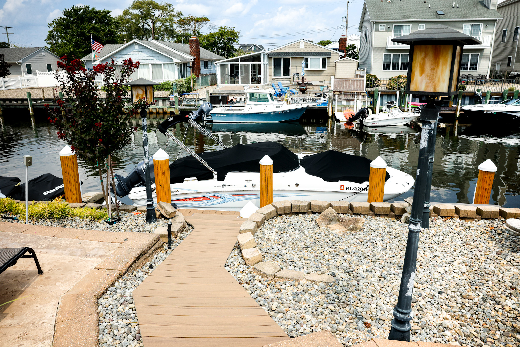We completely rebuilt this waterfront property's dock system using marine-grade materials designed to withstand New Jersey's coastal conditions. The project included installing custom cedar-wrapped pilings with protective caps, laying composite decking for durability and low maintenance, and creating a multi-level dock design that accommodates various boat sizes. The work also involved shoreline stabilization using decorative stone and proper drainage systems. Our team coordinated all marine permits and ensured compliance with local waterfront regulations, delivering a dock system that's both functional and visually striking.