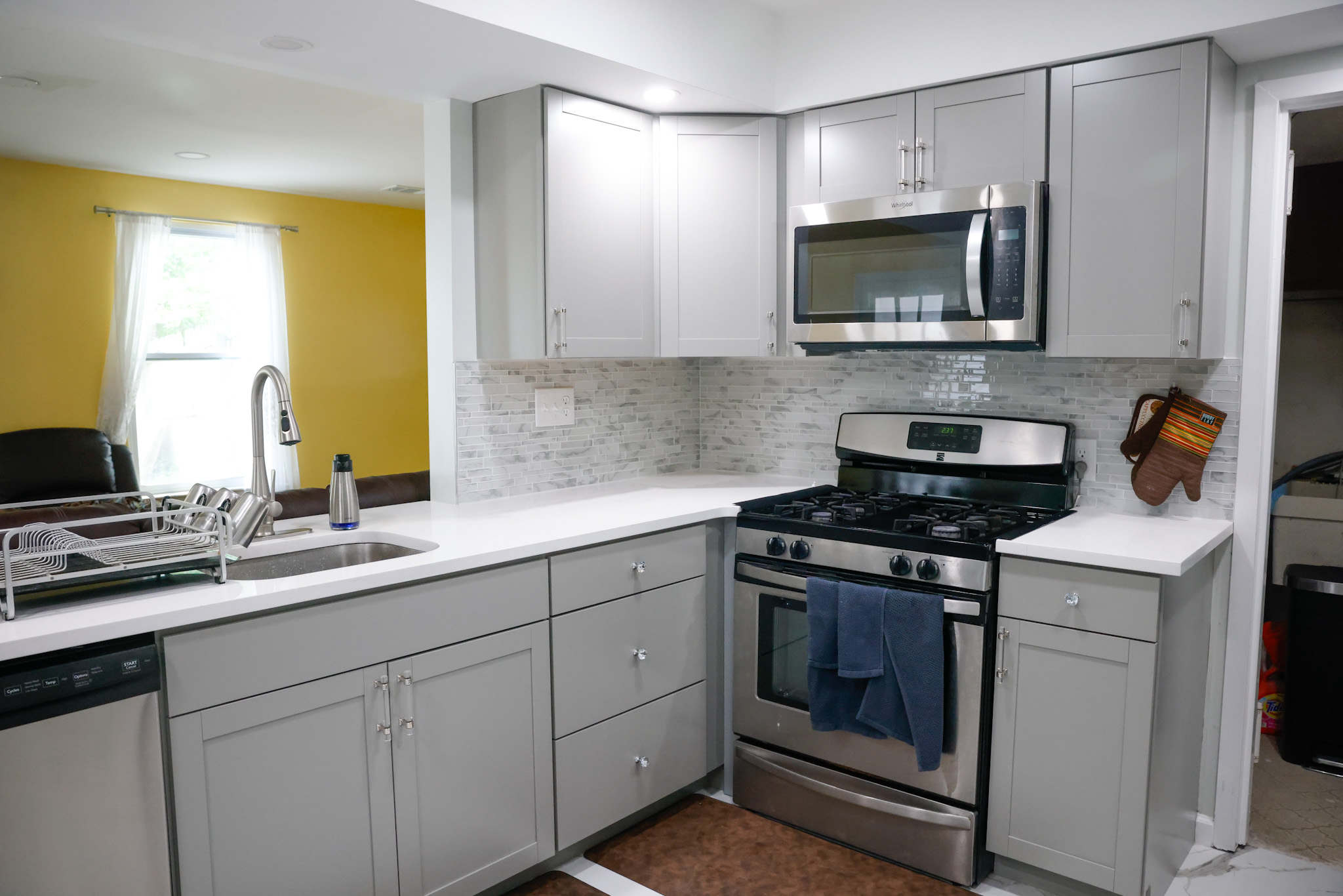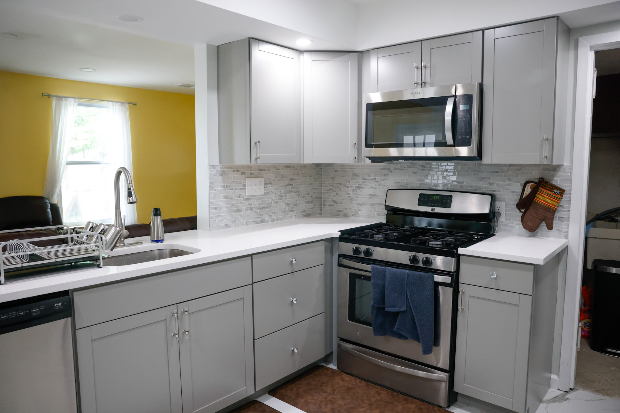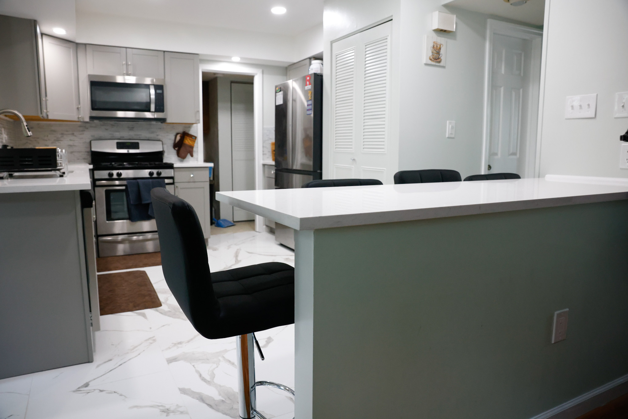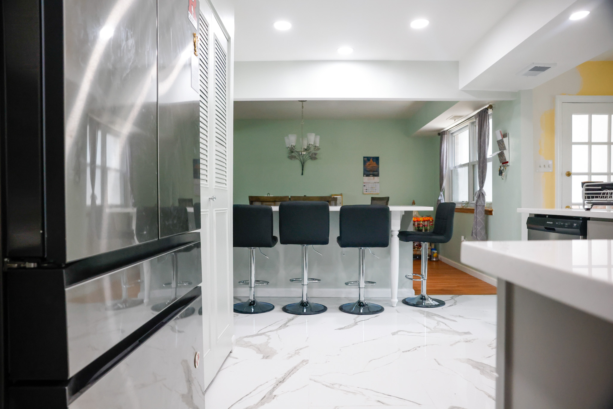 We completely renovated this kitchen to create a modern, open-concept space perfect for entertaining. The project included installing custom gray shaker-style cabinets with soft-close hardware, stunning calacatta marble-look countertops that extend to a spacious breakfast bar, and a coordinating subway tile backsplash. The design features stainless steel appliances including a French door refrigerator and gas range with over-the-range microwave. We added a functional breakfast bar with modern black bar stools, creating additional seating and workspace. The flooring was updated with large-format marble-look porcelain tiles throughout, and we integrated thoughtful storage solutions including tall pantry cabinets. LED recessed lighting provides bright, even illumination while maintaining the clean, contemporary aesthetic.